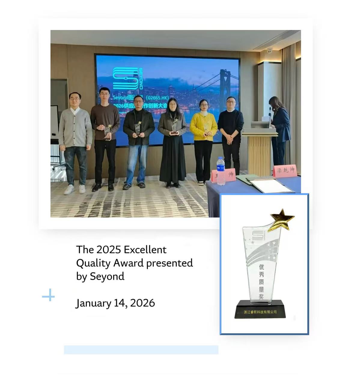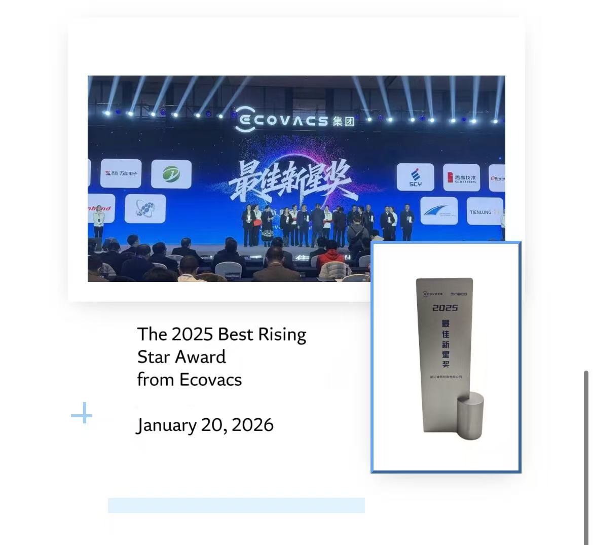 Recently, Raysea Technology has been greeted with a spate of good news, securing two significant honors: it was named the recipient of the 2025 Excellent Quality Award by Seyond, a leading automotive LiDAR manufacturer, and won the 2025 Best Rising Star Award from Ecovacs.