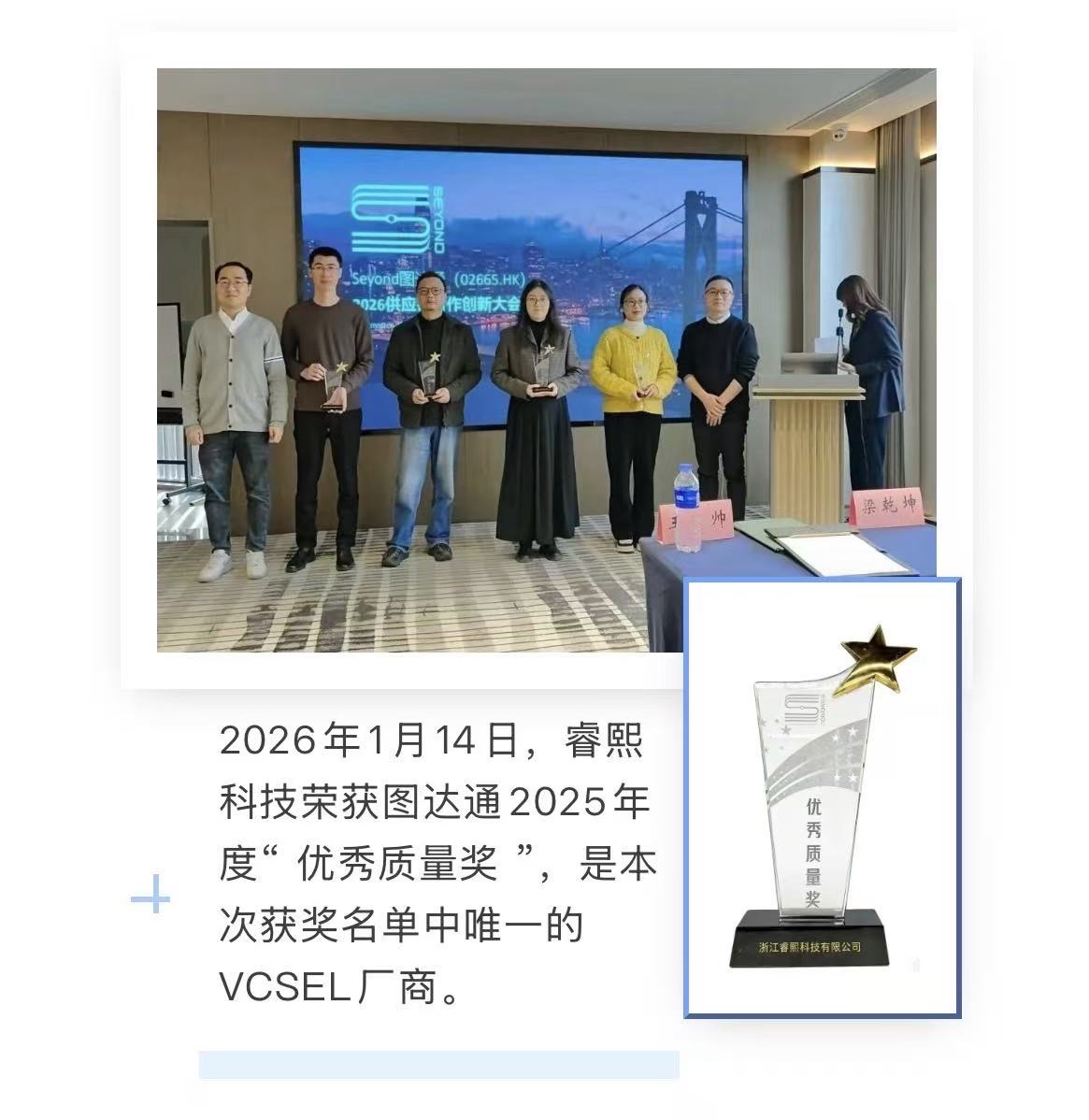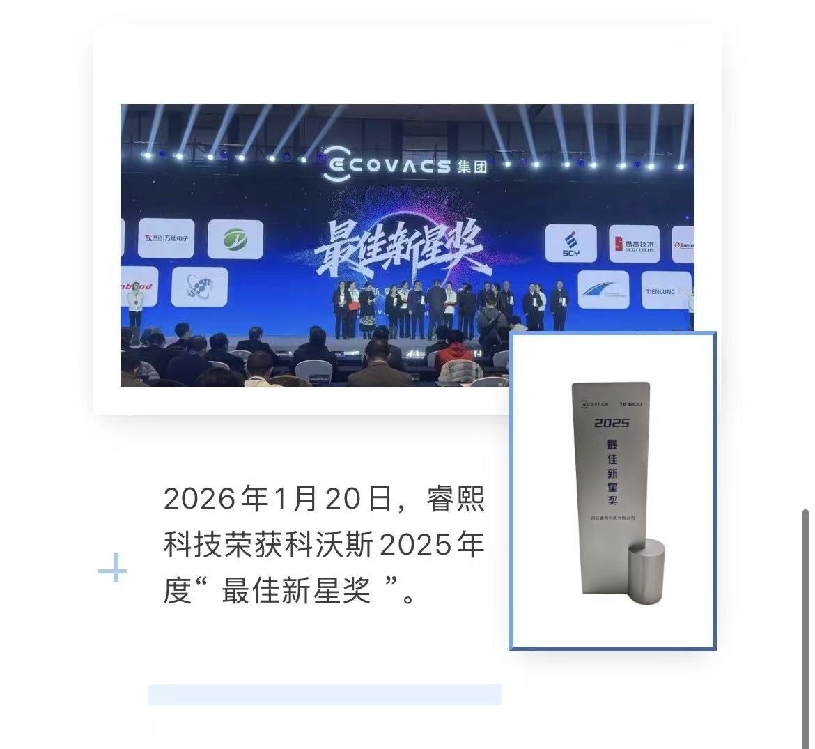近日,睿熙科技捷报频传,一举斩获两项重磅荣誉:获评头部车载激光雷达厂商图达通 2025 年度“优秀质量奖”,并摘得科沃斯2025年度“最佳新星奖”。