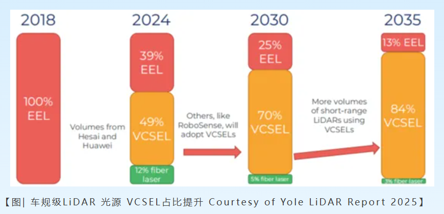 在半固态激光雷达中,扫描部件通常采用 MEMS 或棱镜/转镜的方式,而激光的光源也逐渐从光纤激光器或 EEL 切换至 VCSEL。自 2024 年起,VCSEL 在半固态激光雷达中的出货量已经接近50%。随着 VCSEL 在新一代激光雷达系统中展现出的低温漂系数、窄线宽、低功耗等优势,采用 VCSEL 的激光雷达比例将会逐步上升。