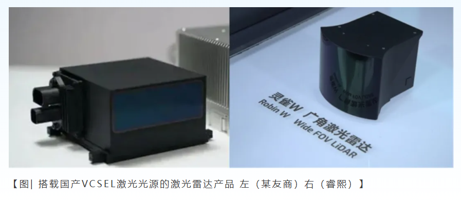 2024 年量产上车的激光雷达中,除了来自海外厂商(如 Lumentum)的 VCSEL 产品外,国产 VCSEL 芯片也已经逐步实现前装上车。例如,某友商的 VCSEL 芯片被应用于华为系的 D3 主雷达,而睿熙科技的 VCSEL 芯片则被用于图达通系Robin-W灵雀W广角激光雷达。迈入 2025 年,搭载国产 VCSEL 芯片的全固态激光雷达产品也将逐步在量产车型上得到应用。
