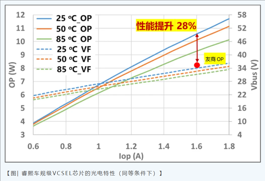 在相同激光照射距离下,更高的 PCE 可以实现更远的探测距离,或者在相同距离下实现更低的功耗。得益于睿熙的重构多结 SOMJ 架构,在同等测试条件下,睿熙 VCSEL 芯片能够相较友商提升 28%。