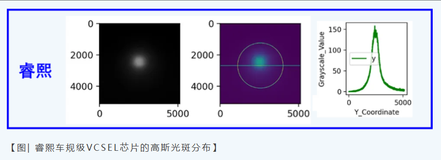低发散角有助于简化激光雷达的光路设计并提升激光雷达的测距范围。得益于睿熙的重构多结架构,睿熙 VCSEL 芯片已经可以做到 8°~10°的发散角,並且呈现高度集中化的高斯光斑分布,这将大大简化光学设计并提升激光雷达的测距能力。