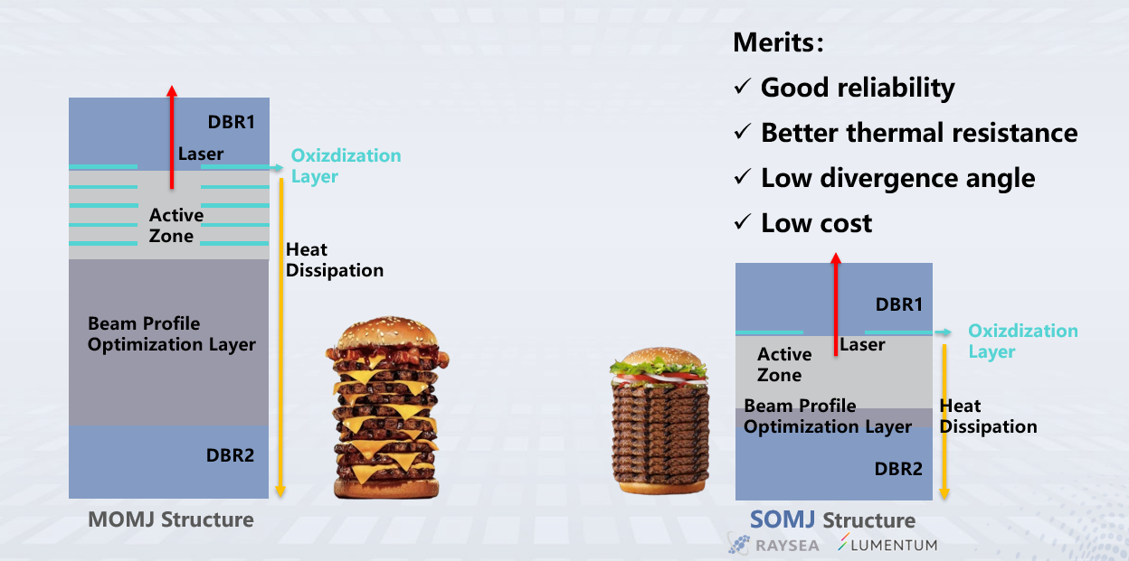 面向自动驾驶、具身智能对激光感知高功率、高精度、高可靠性的严苛需求,陈睿重点介绍公司全自研单氧化层多结SOMJ VCSEL技术平台,凭借更高功率密度、高占空比运行、卓越电光转换效率、更小发散角、车规级可靠性五大核心优势,实现业界领先的10-14结线阵VCSEL研发成果,功率密度最高可达7KW/mm²,发散角稳定在10°左右,并采用单氧化层单元结构,兼顾高性能与量产一致性。